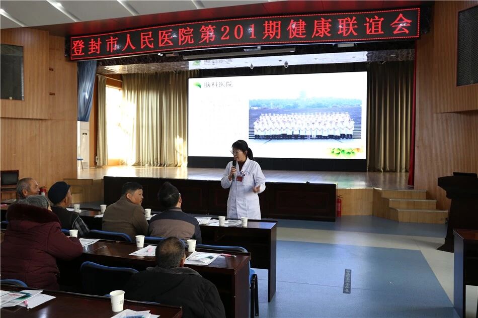 近年来脑卒中发病率呈上升趋势,是威胁人类的三大疾病之一,位居人类死亡原因的前三位,是中老年人致死和致残的主要疾病,为预防疾病、促进健康,提高广大患者与家属的自我健康意识,2019年12月4日下午三点,登封市人民医院神经内科在我院多功能报告厅举办了题为“防治脑卒中,我们在行动”健康联谊会。